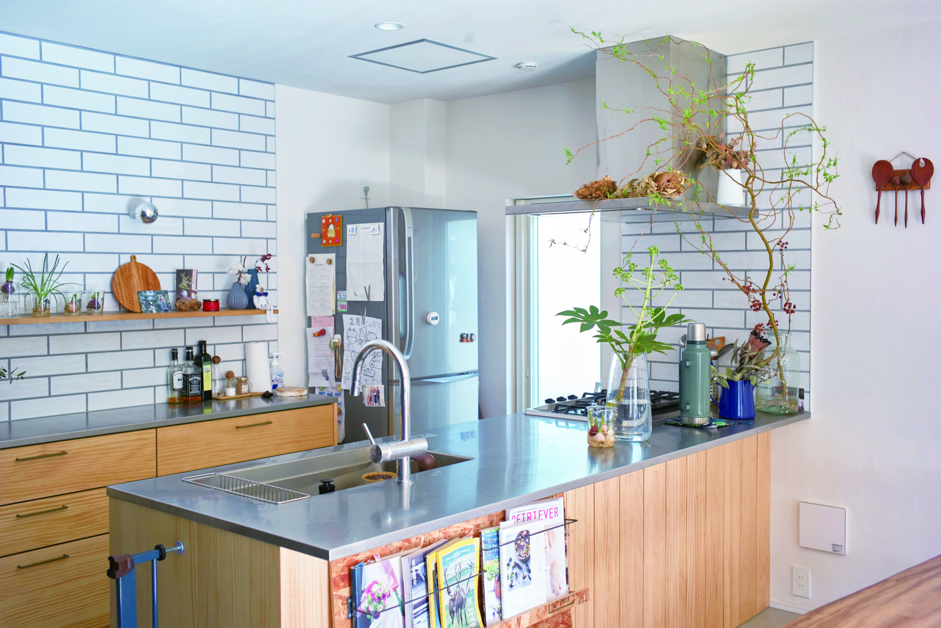 テーブルクロスはニューヨーク(TRAVERS)のもの。刺繍が美しく、色違いのブルーやグリーンでもガラリとイメージが変わります。