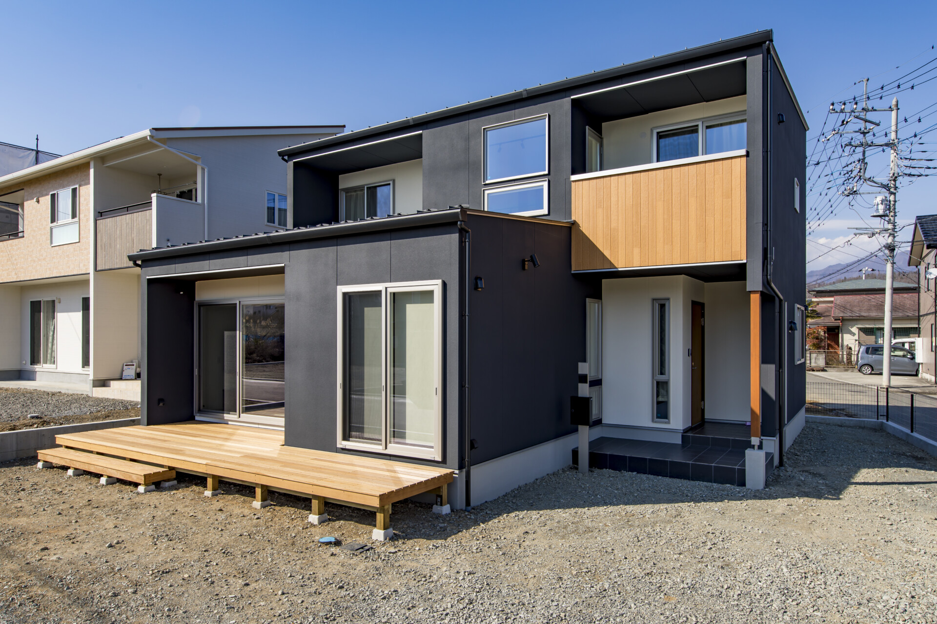 木とベンチのある少し奥まったエントランスを入ると、壁掛けテレビやテーブルと座席のあるフロントエリアが現れます。