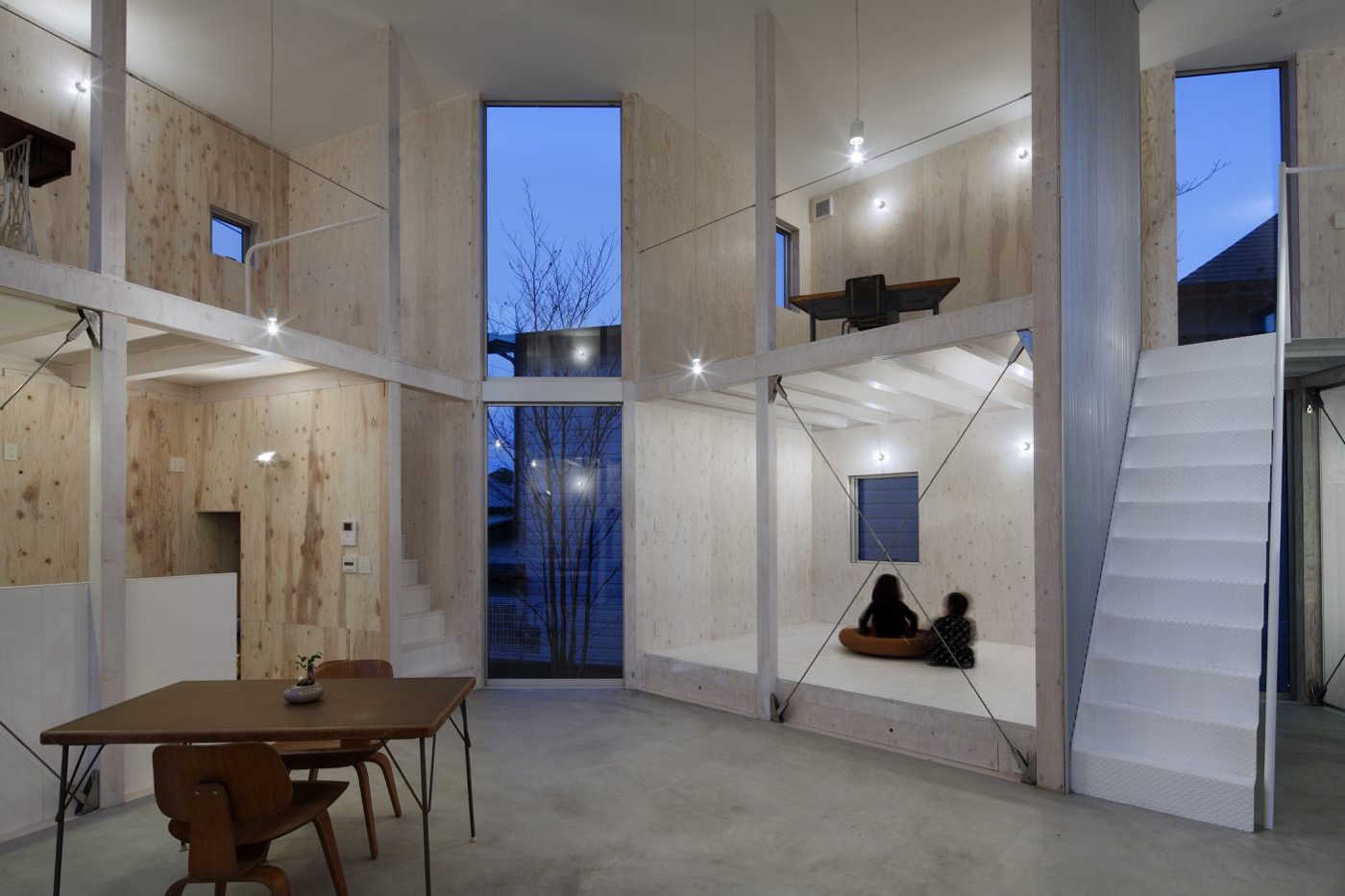 部屋は内階段が設けられたメゾネットなので、2階層分の大きい開口の前に明るいリビングの空間が広がります。開口は木製のサッシで上部ははめごろし。バルコニー側にスラブが跳ね出しており、庇の役割を担っています。下部のサッシは折れ戸になっており、両側を開けると全体がオープンにあり外のバルコニーと一体となる仕組みになっています。この間口寸法は3700mで、ダイニング天井高さは2350mm、吹抜け天井高さ約4900mmというボリューム感。寸法だけ見るとコンパクトですが、実際には充分な解放感が感じられます。更に、開口部の下には設備の空調があり、冬は回転させれば温風が吹き出す優れた納まりに。