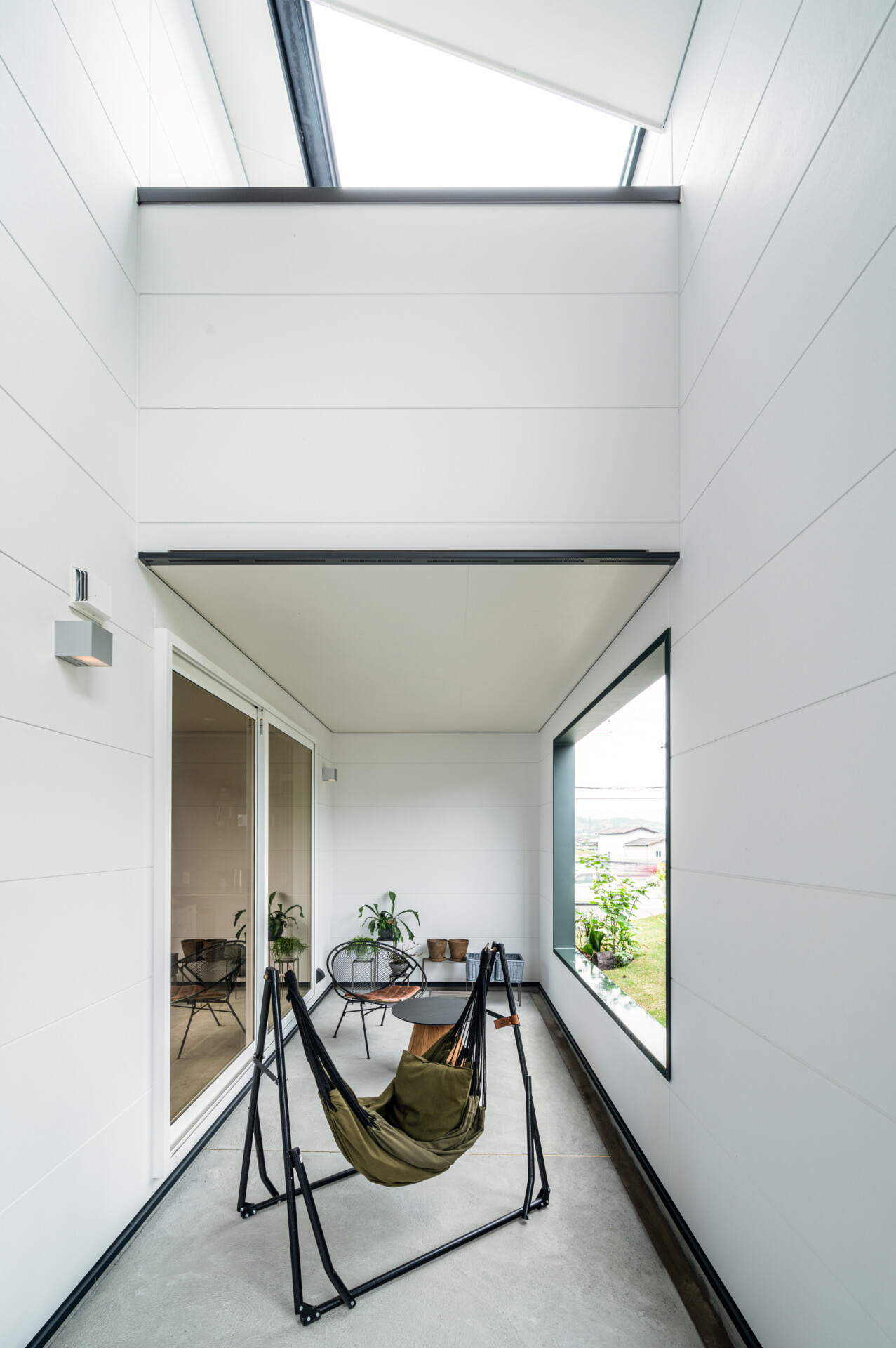 明るくて心地良い吹き抜けの空間は、壁側から緩やかにトップライトに変化した開口部により開放感がある。水平な床はあっても壁は斜めになっており、どこを見渡しても「直角に交わるところ」が見当たらない。