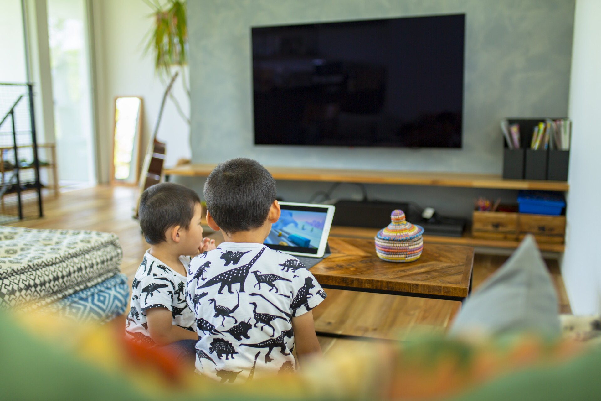 彫り込み天井や同じ高さの軒天井と室内天井により、光の取り込みが容易で明るく快適なリビングが実現します。凝ったインテリアも取り入れており、平屋の魅力を最大限に引き出しています。