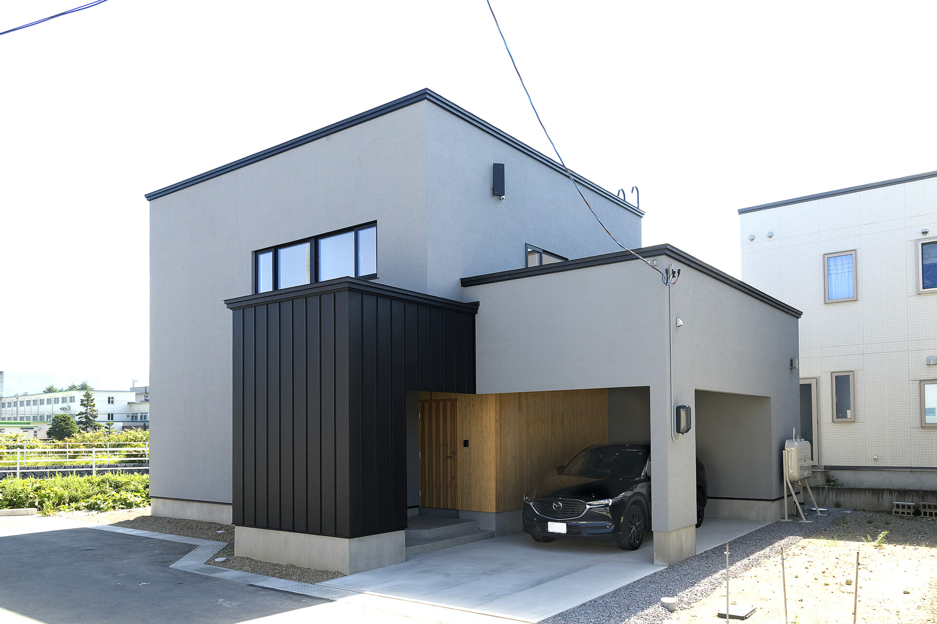 casa cubeのデザインで印象的なのは、一見して窓がない四角いフォルムの外観。無駄をそぎ落としたスタイリッシュなデザインは、長く暮らしていても飽きにくいのが特徴です。正面には窓がないため、継ぎ目のないマットな外壁が引き立ちます。外壁には、職人が丁寧に塗りあげた、手仕上げの塗り壁を採用。温かみのあるテクスチャが魅力的で、単にシンプルなだけでは終わらない奥深さを感じられます。