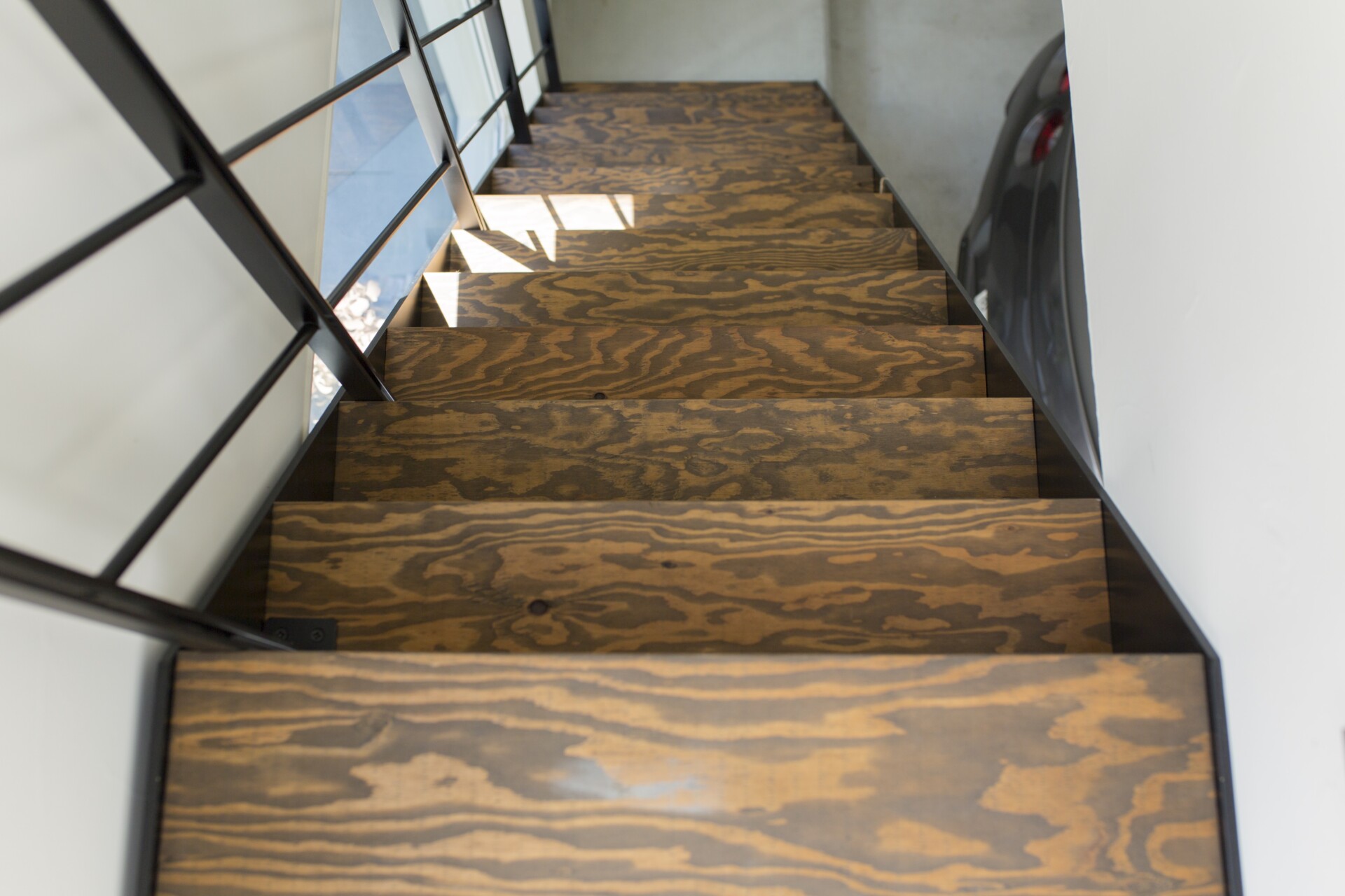 玄関の土間上部にはスケルトン階段を設置することで空間を効率的に活用しつつ、視線の抜けもあるため圧迫感を最小限にカット。