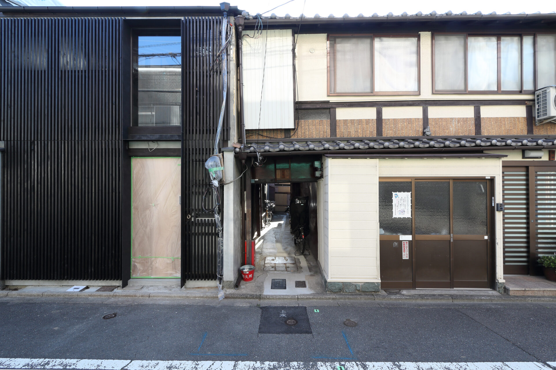 入口前に設えられた外階段を数段下りて半地下のドアの前に立つと、アプローチの土留めコンクリート、屋根の軒先などが間近に見られます。