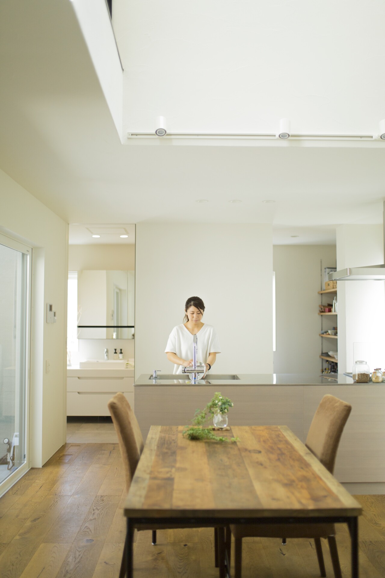 自然光は、住宅の快適性に大きく影響します。「casa nord」では、冬の短い日照時間でも最大限の光を取り入れられるよう、窓の配置に工夫がされています。高い位置に設けられた窓は、直接的な光だけでなく、反射光も室内に取り込む設計となっており、明るく心地よい空間を実現しています。