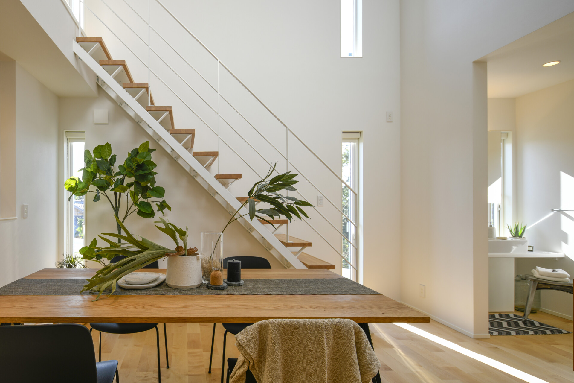 横並びのダイニングテーブルより距離感も近くなります。
