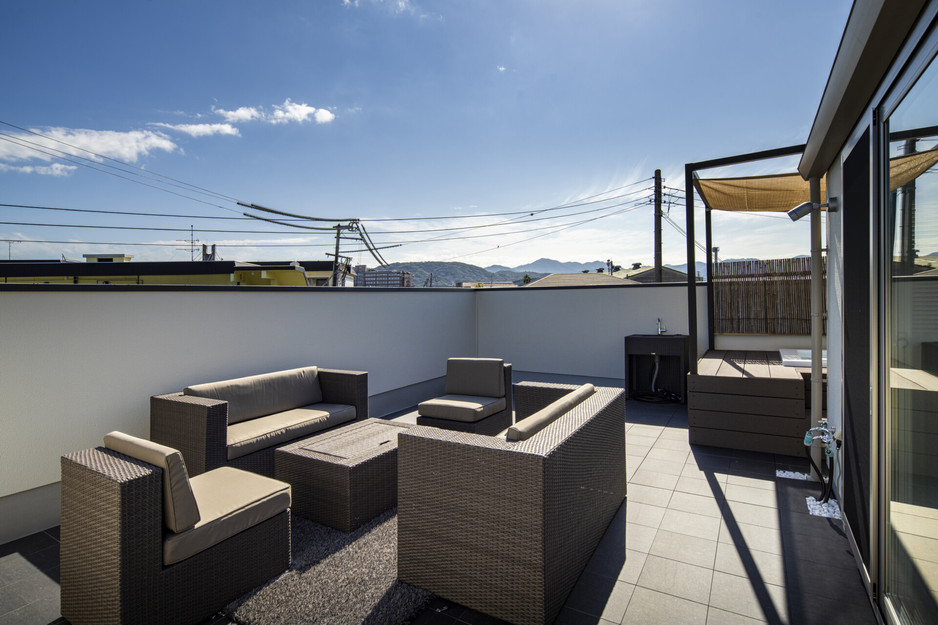 中庭には水栓も用意しているため、アウトドア用品などの掃除も行うことができ、支度から片付けの全てがここで完結するような形になっています。