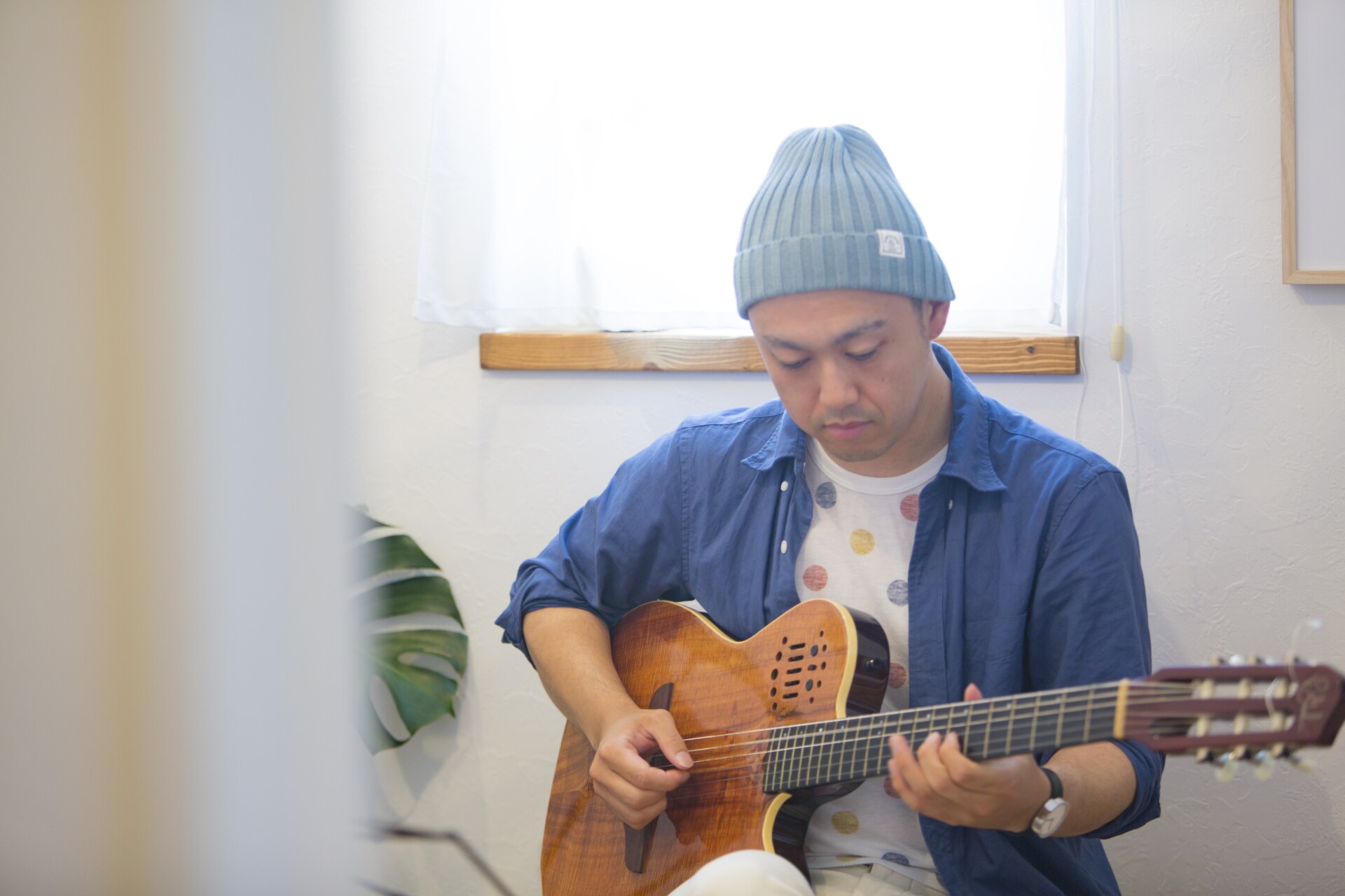 収納はカップボードタイプを配置。エアコンは木の格子で隠すことで、エアコンの存在感を和らげ、すっきりとした空間にまとめています。