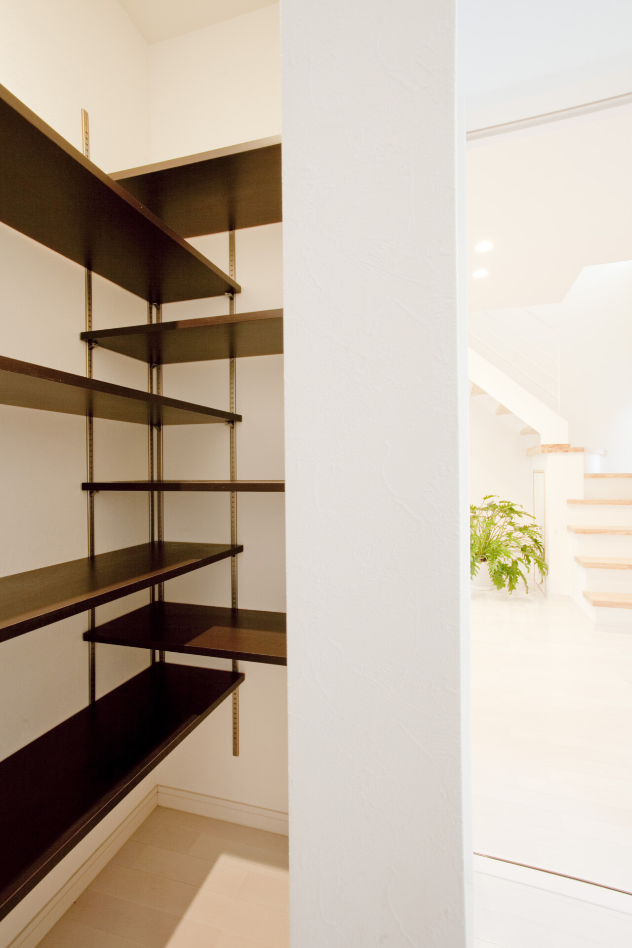 玄関扉側の収納が一番大きく、中庭で使うアウトドア用品などもしまうことができます。シューズクロークはそれぞれ8段用意。奥行きは60cmあるため、奥と手前にシューズを2足並べることも可能。収納力抜群です。