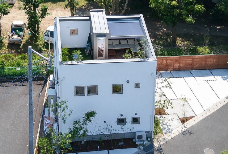 水平に連続する建物群は威圧感がなく、同じ石材やタイルが仕上げに使われているため自然な統一感が感じられます。