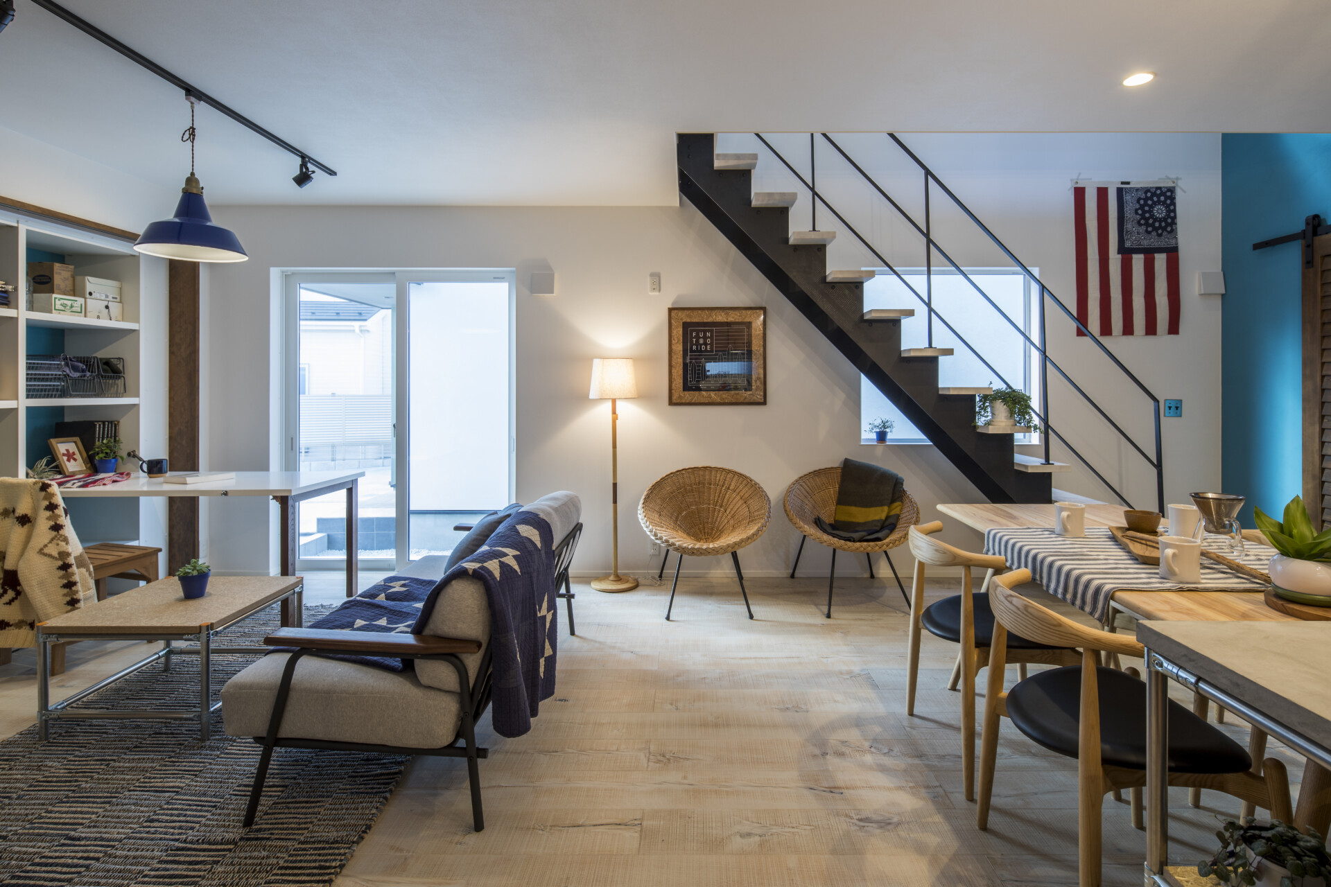 室内は1階にプライベートルームがあり、2階にパブリックスペースが配された構成となっています。白を基調にしつつ、フローリングや木のインテリアがやわらかな温かみを添える心地の良い空間です。
