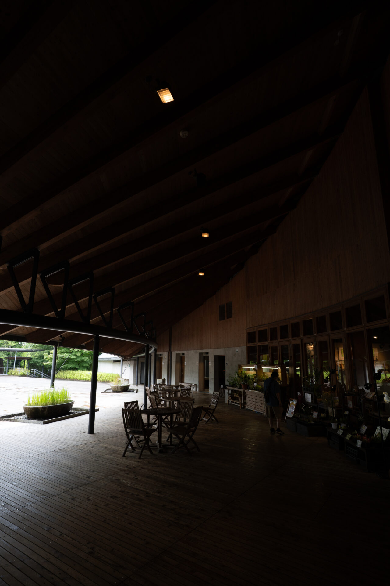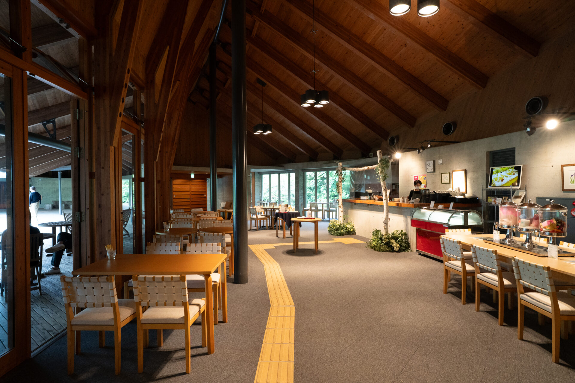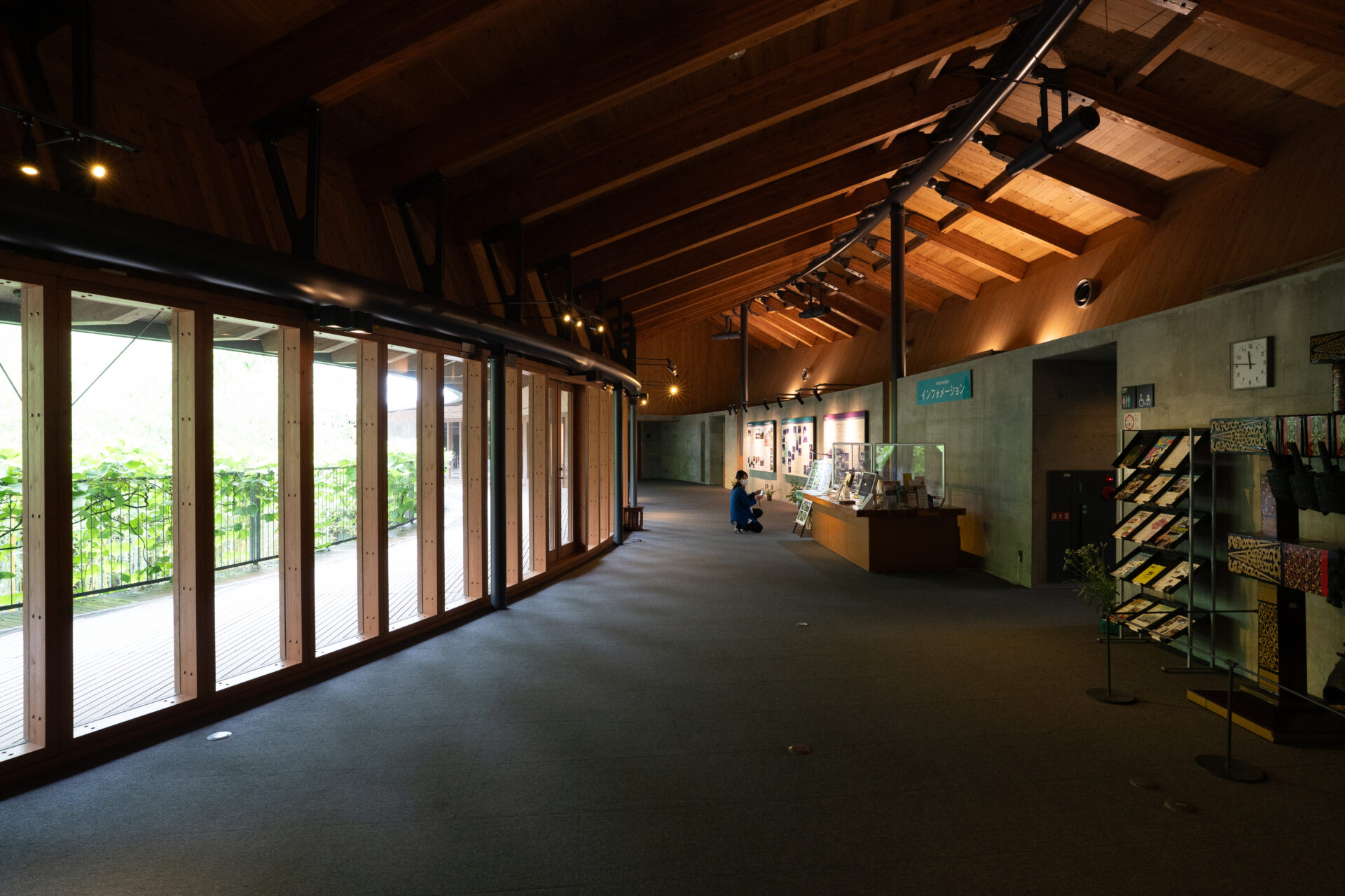特にメイン棟に見られるのは、集成材(GLULAM)を使用した巨大な木造トラス構造です。太い梁や柱が交差するさまは、まるで森の樹木が枝を広げているかのようで、圧倒的な構造美を誇ります。