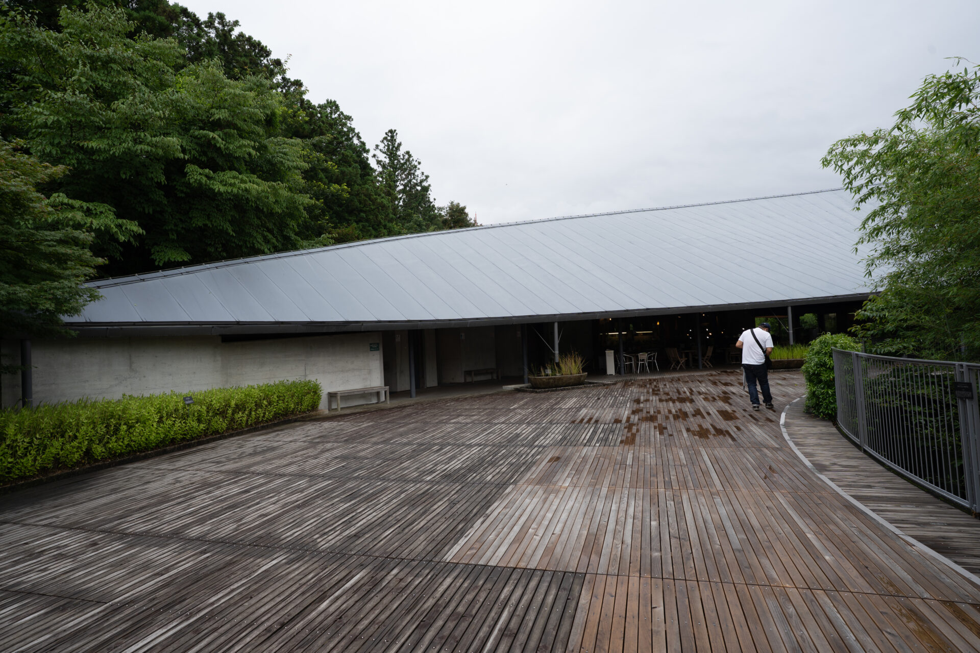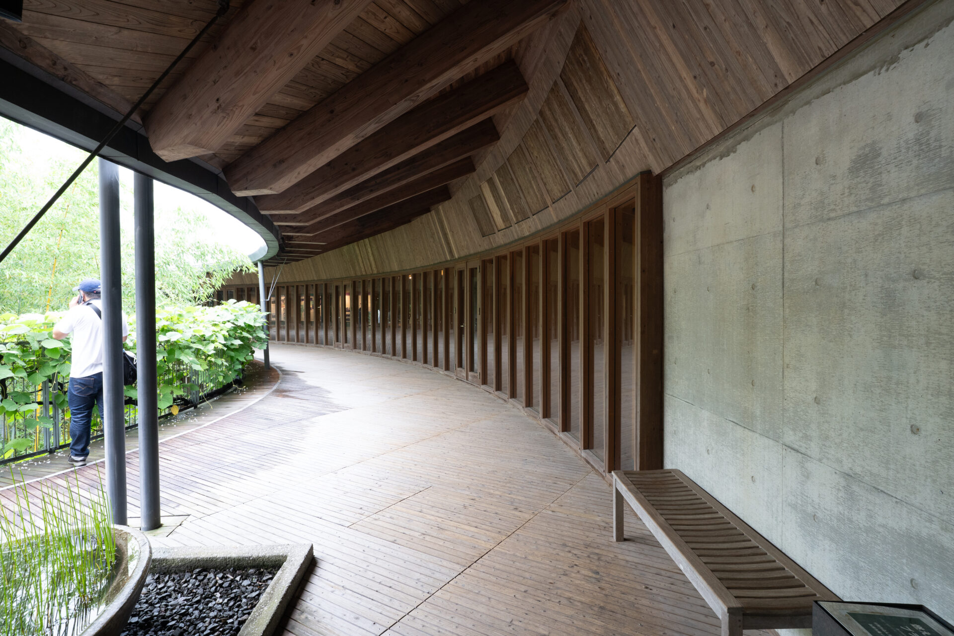 内藤廣の建築は、「自然を招き入れる装置」としての役割を果たしています。牧野富太郎記念館は、展示室と展示室の間、そして建物の外側に沿って、深い軒を持つ広々とした回廊(廊下)が巡らされています。