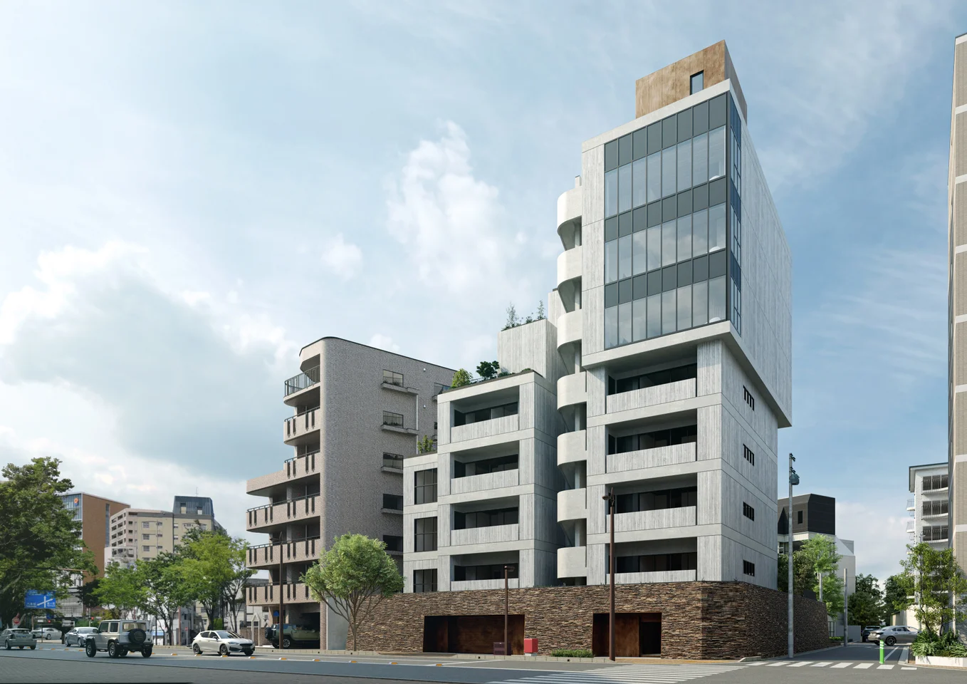 第1号物件『GROUNDI OHORI(グラウンディ大濠)』は、福岡市中央区大濠1丁目に計画される地上9階・全10邸のスモールラグジュアリーです。