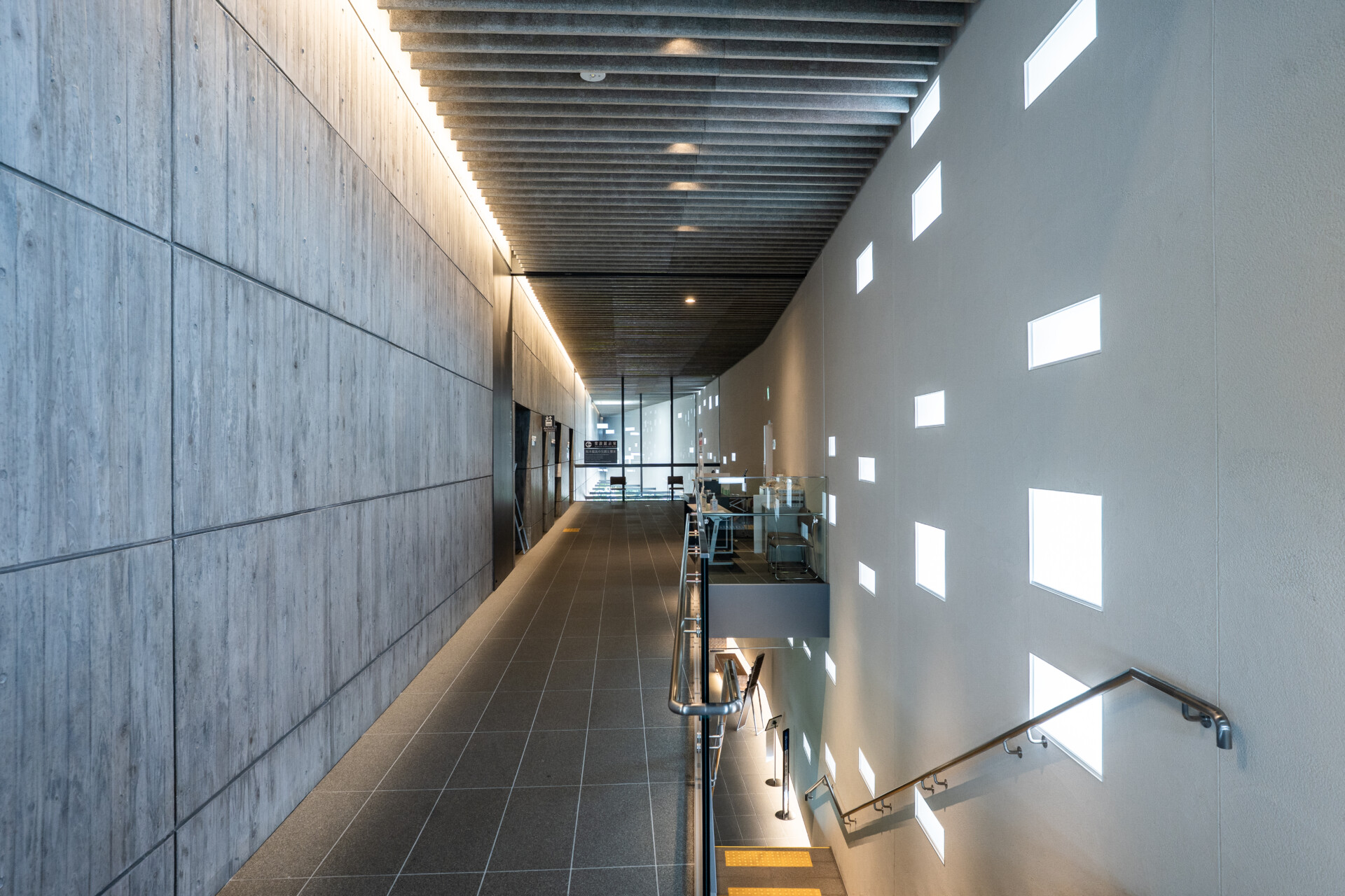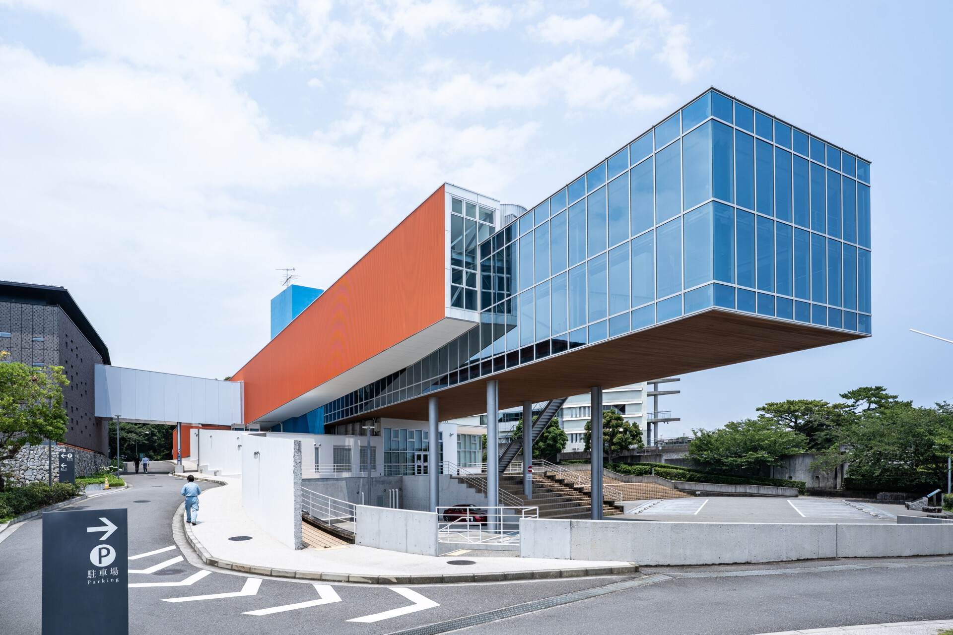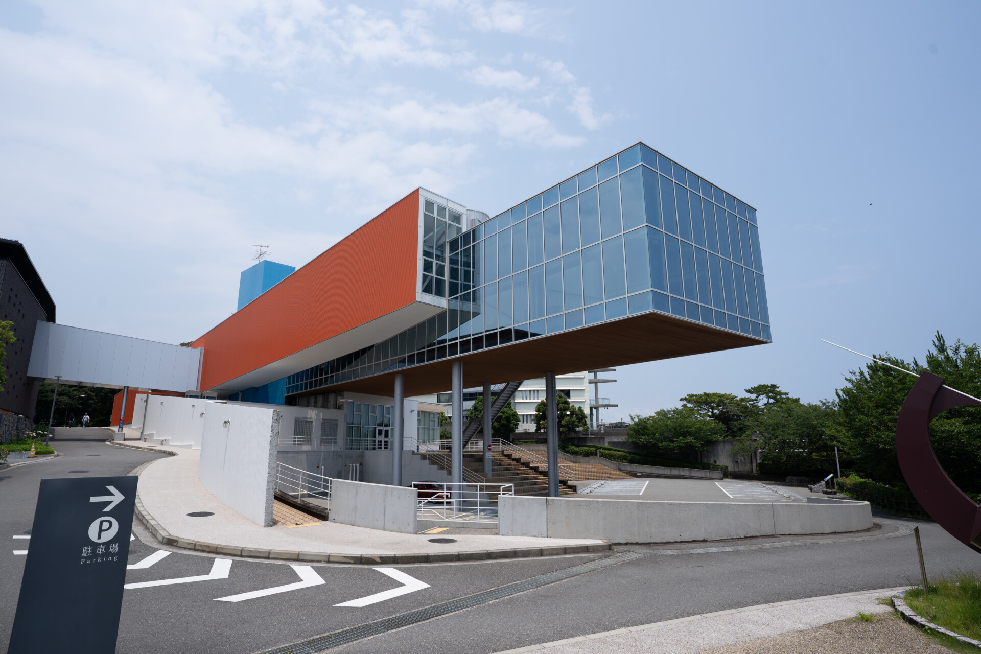 建築は地形の高低差を活かした立体的な構成となっており、外部からはコンクリートと大判ガラスによる力強いボリュームが印象的です。