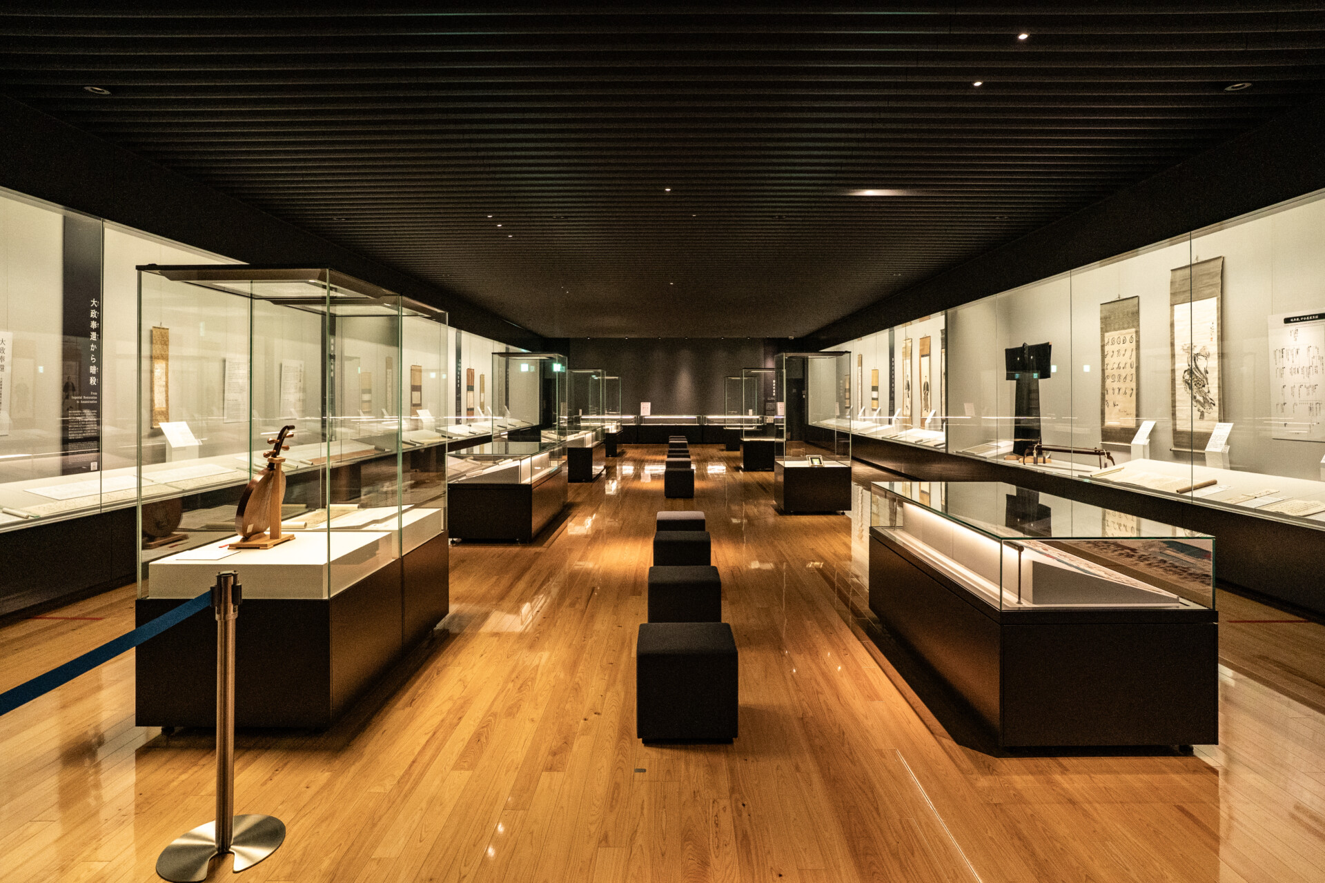 龍馬の生涯をたどる展示室は、圧迫感を感じさせない天井高と適切な照明計画によって、来館者が自然と展示物に引き込まれるよう工夫されています。