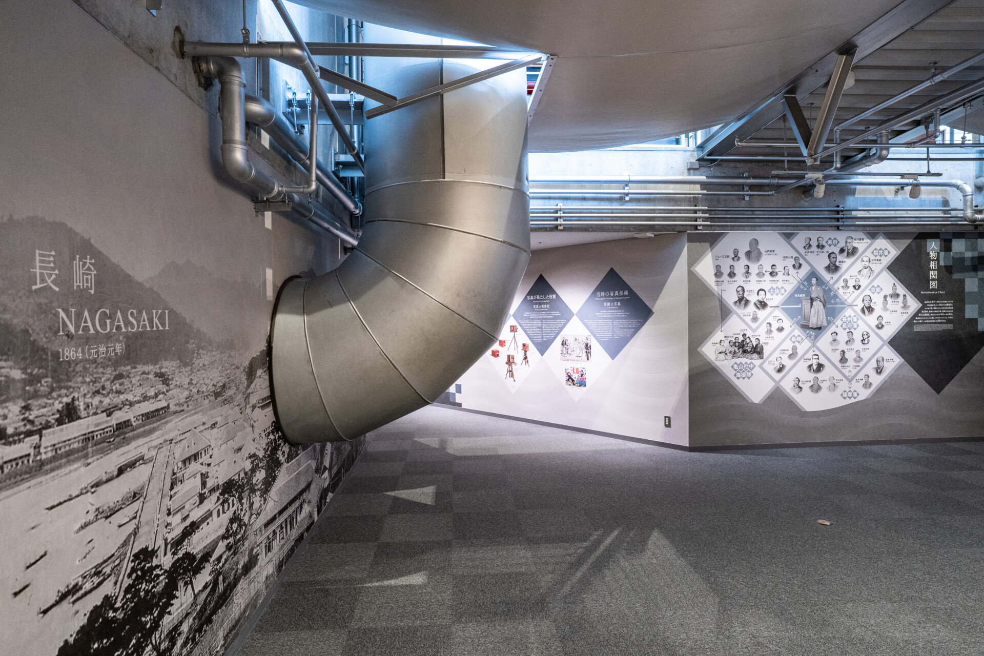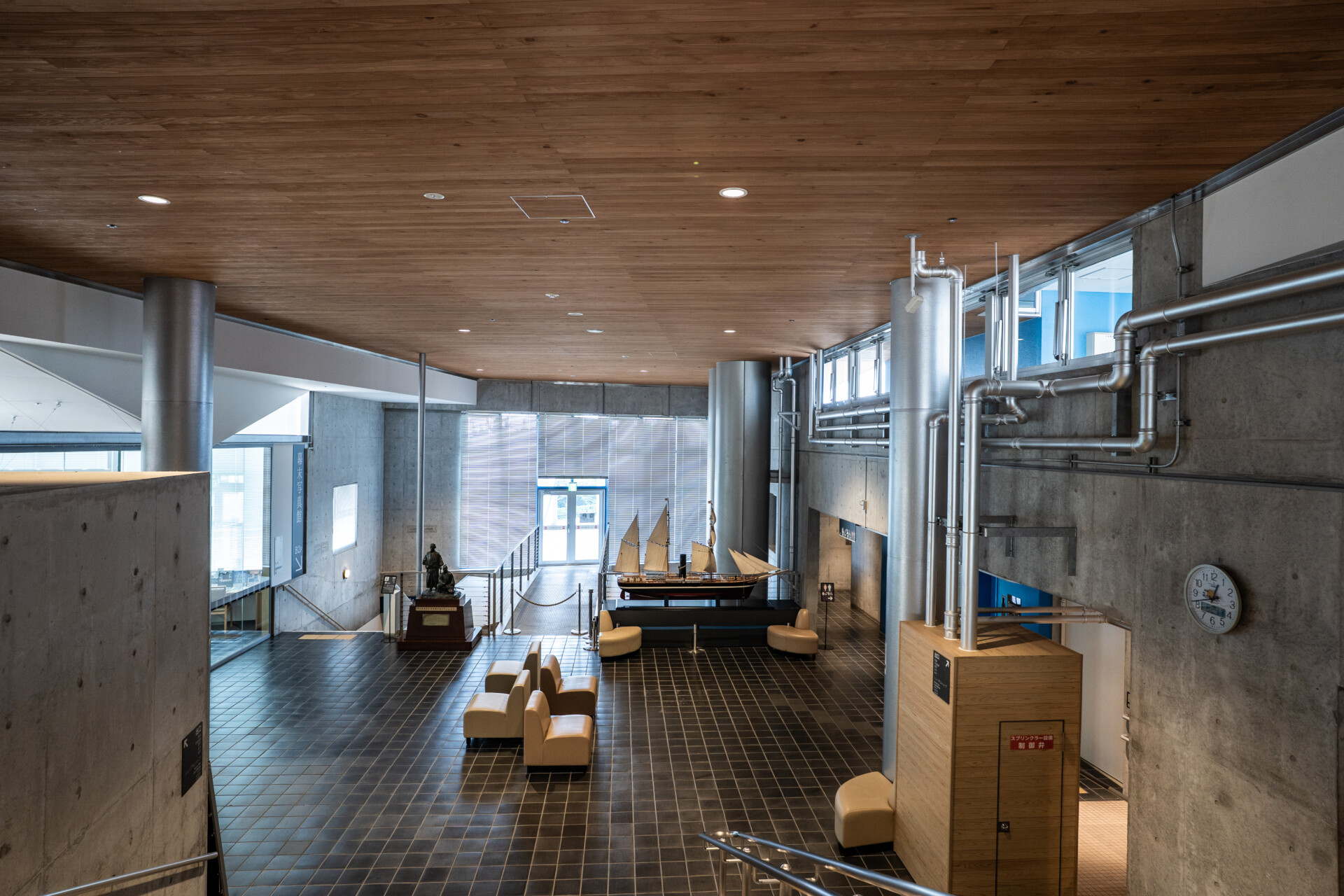 内部空間は歴史展示と建築体験が一体となって構成されています。