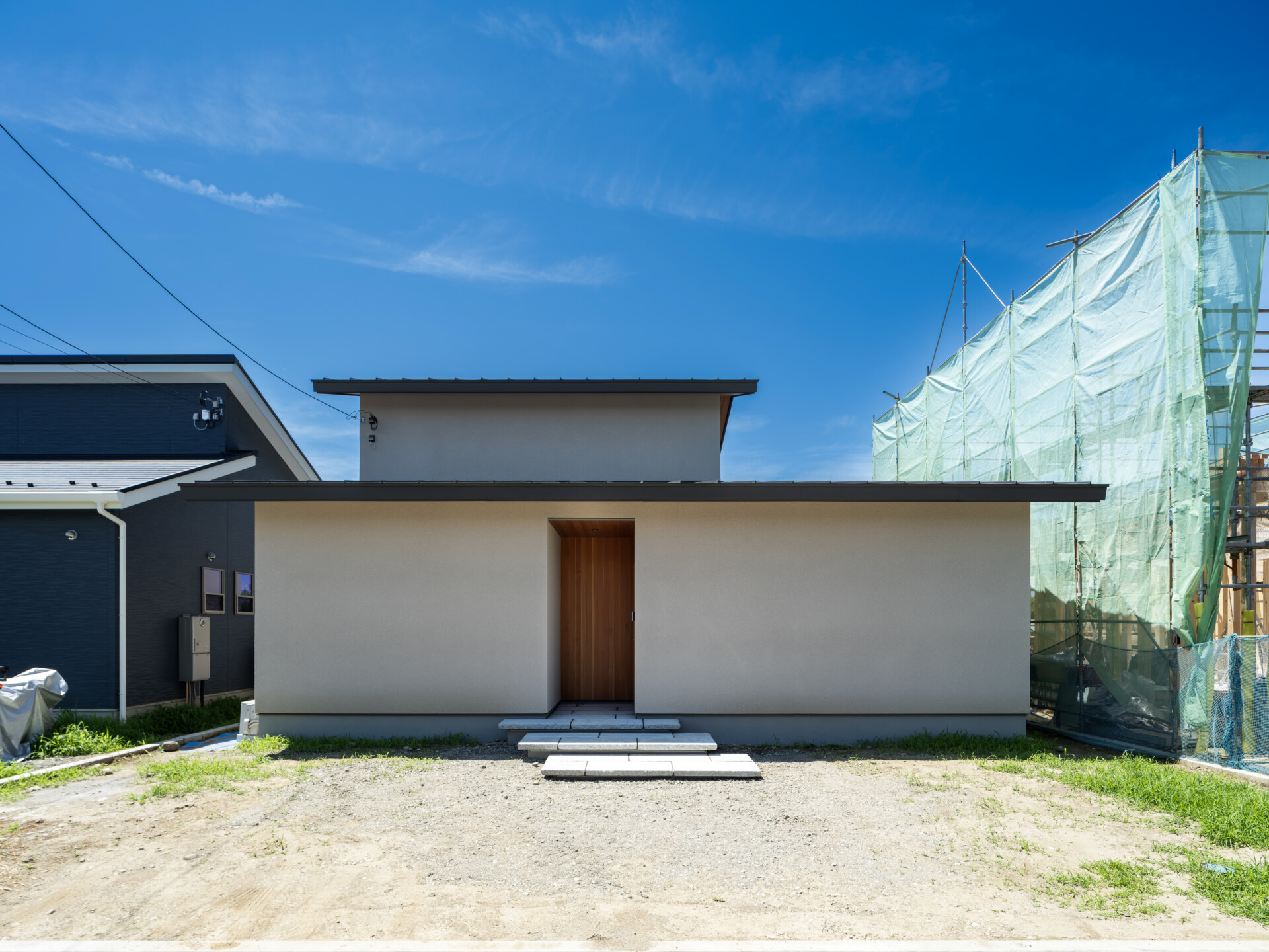 北側の道路から見るこの家の顔は、驚くほどシンプルです。白い壁に、木の温もりを感じさせる玄関扉がひとつ。余計な装飾は何もなく、暮らしの気配すらほとんど読み取れません。それは意図的な選択です。道路側からの視線を受け流しながら、内側の空間を守るための、静かな知性が宿った外観デザインです。
