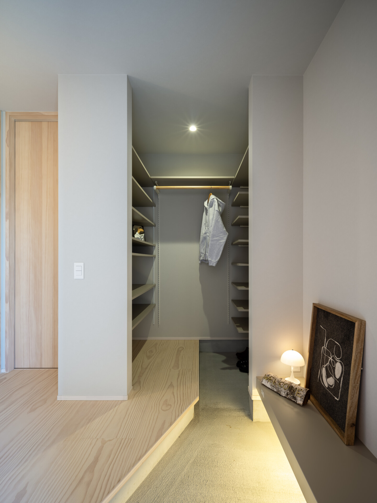 土間とフロアの境には緩やかな段差があり、足元の間接照明がその切り替わりを美しく演出しています。玄関という「家の顔」に、機能とデザインの両立を丁寧に施した空間です。シューズクローゼットは玄関に隣接しており、生活感を表に出さないための動線がきちんと考えられています。