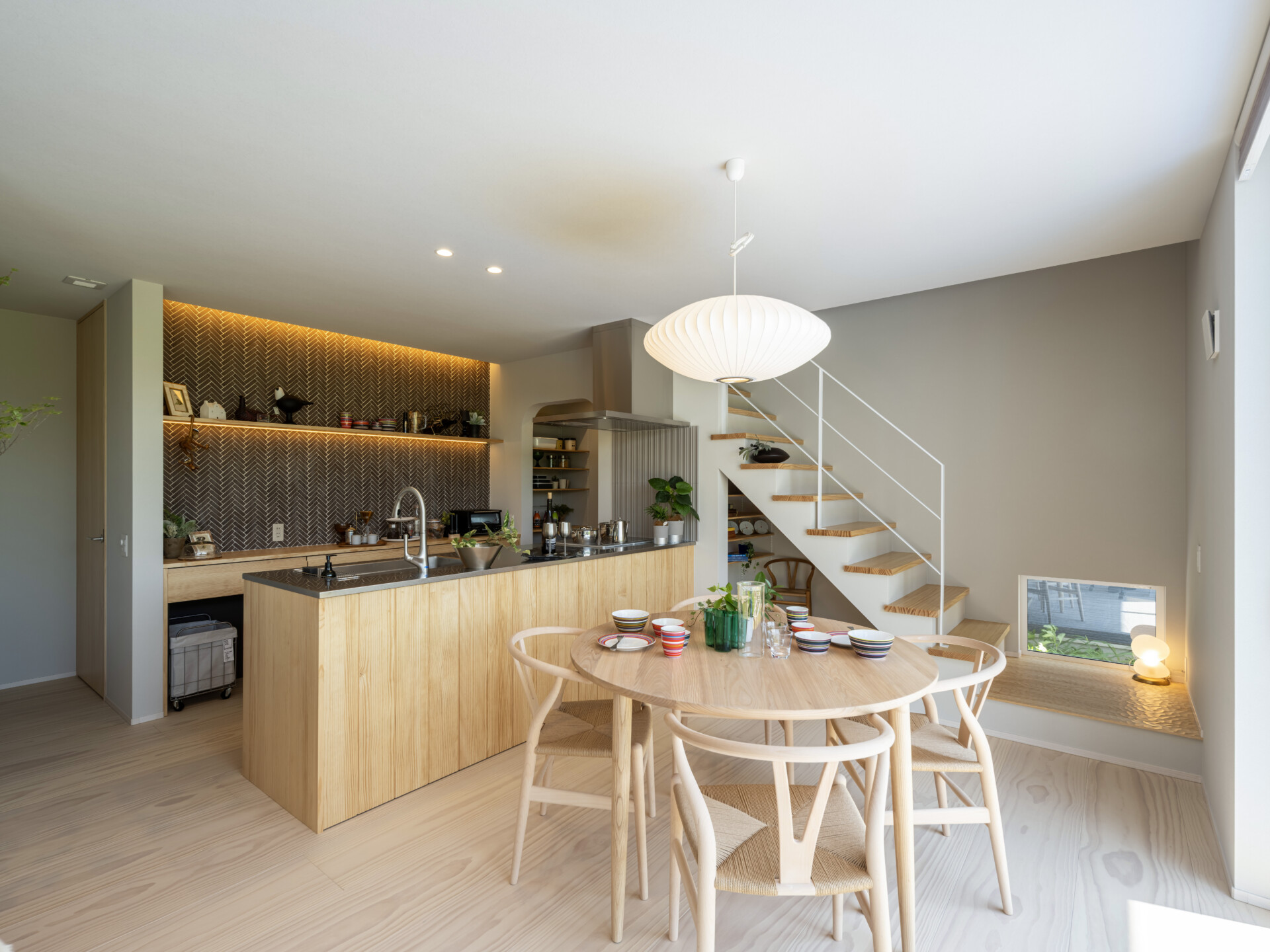 LDKの一角に設けられた階段は、白いスチールの手摺と木の踏み板の組み合わせで構成されています。スケルトン階段ではなくひな壇型の構造ながら、白い手摺が連続するラインは軽やかで、空間に縦の抜けをつくりだしています。階段下のスペースも余すことなく活用されており、植物や小物が飾られ、階段自体がインテリアの一部として機能しています。