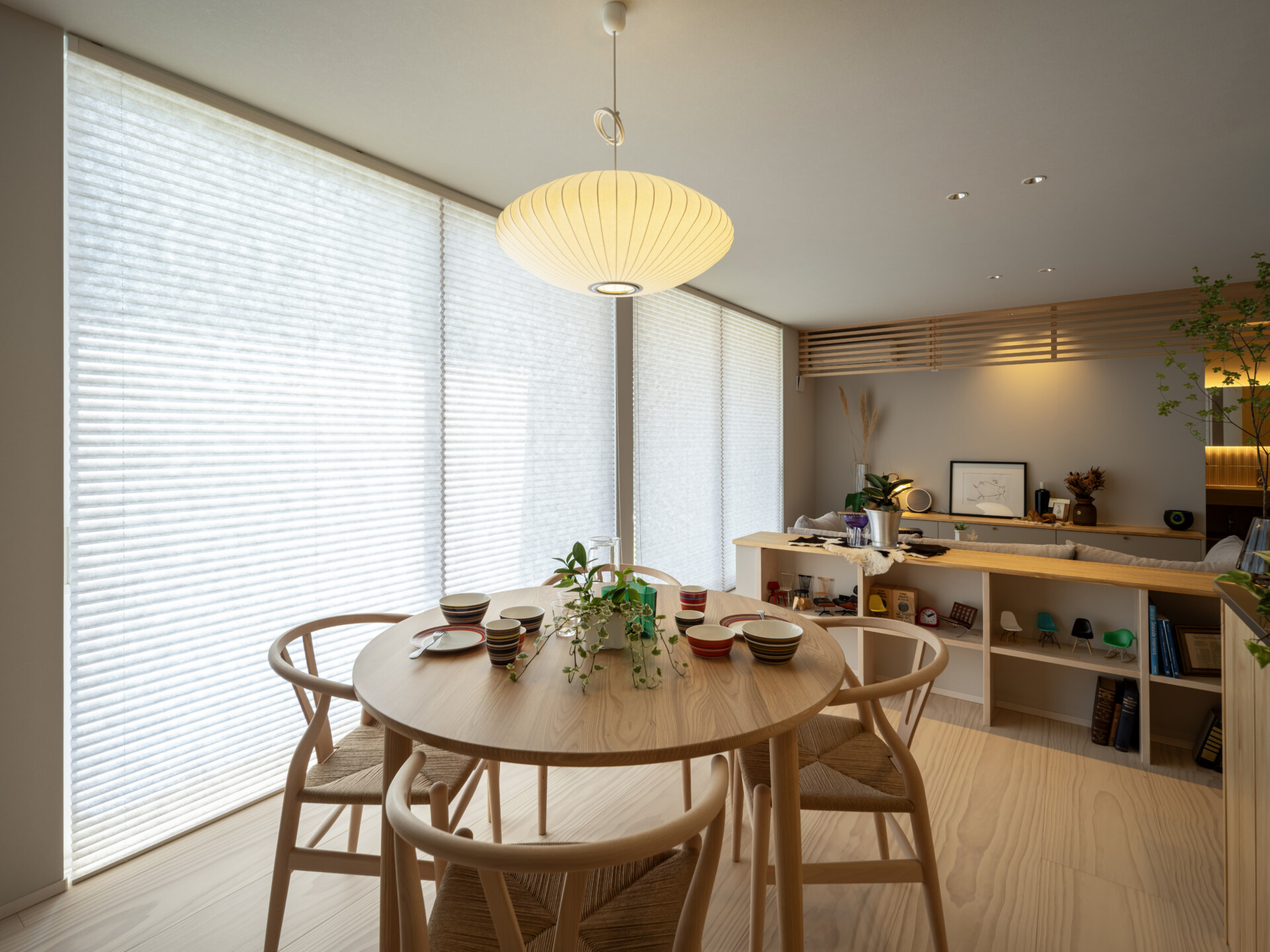 ダイニングテーブルは丸テーブルが選ばれており、4脚のチェアが囲む姿は、小さな円卓を思わせる親密さを持っています。南の大開口から差し込む光の中で食事をする時間は、日常でありながら非日常の豊かさを帯びたものになるでしょう。