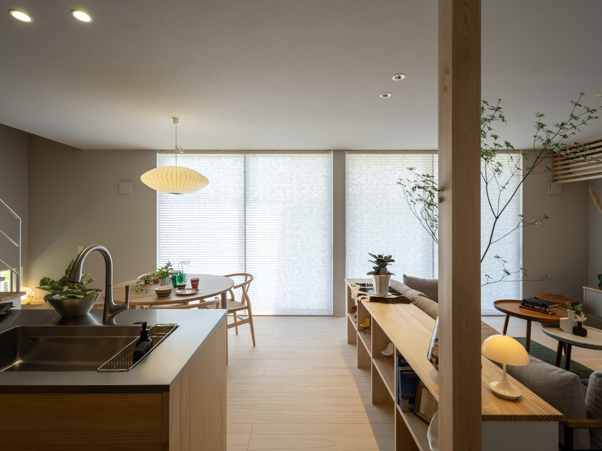 リビングには木の化粧柱が立ち、構造的な役割を果たしながら空間のアクセントにもなっています。その柱から枝を伸ばした植物が天井に向かって伸び、室内に自然の生命感を吹き込んでいます。照明にはネルソンのバブルランプが採用されており、その有機的なフォルムが空間に知性と遊び心を添えています。