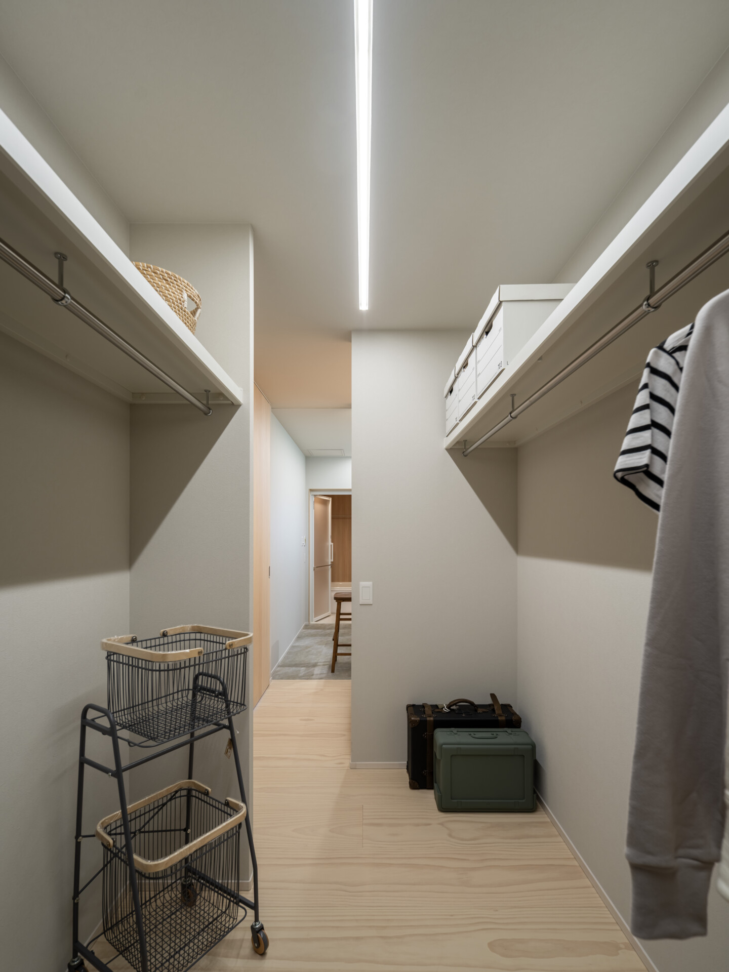 寝室に隣接するファミリークローゼットは、夫婦の衣類を一か所で管理できる動線設計になっており、ハンガーパイプと可動棚の組み合わせで収納の自由度が高く確保されています。
