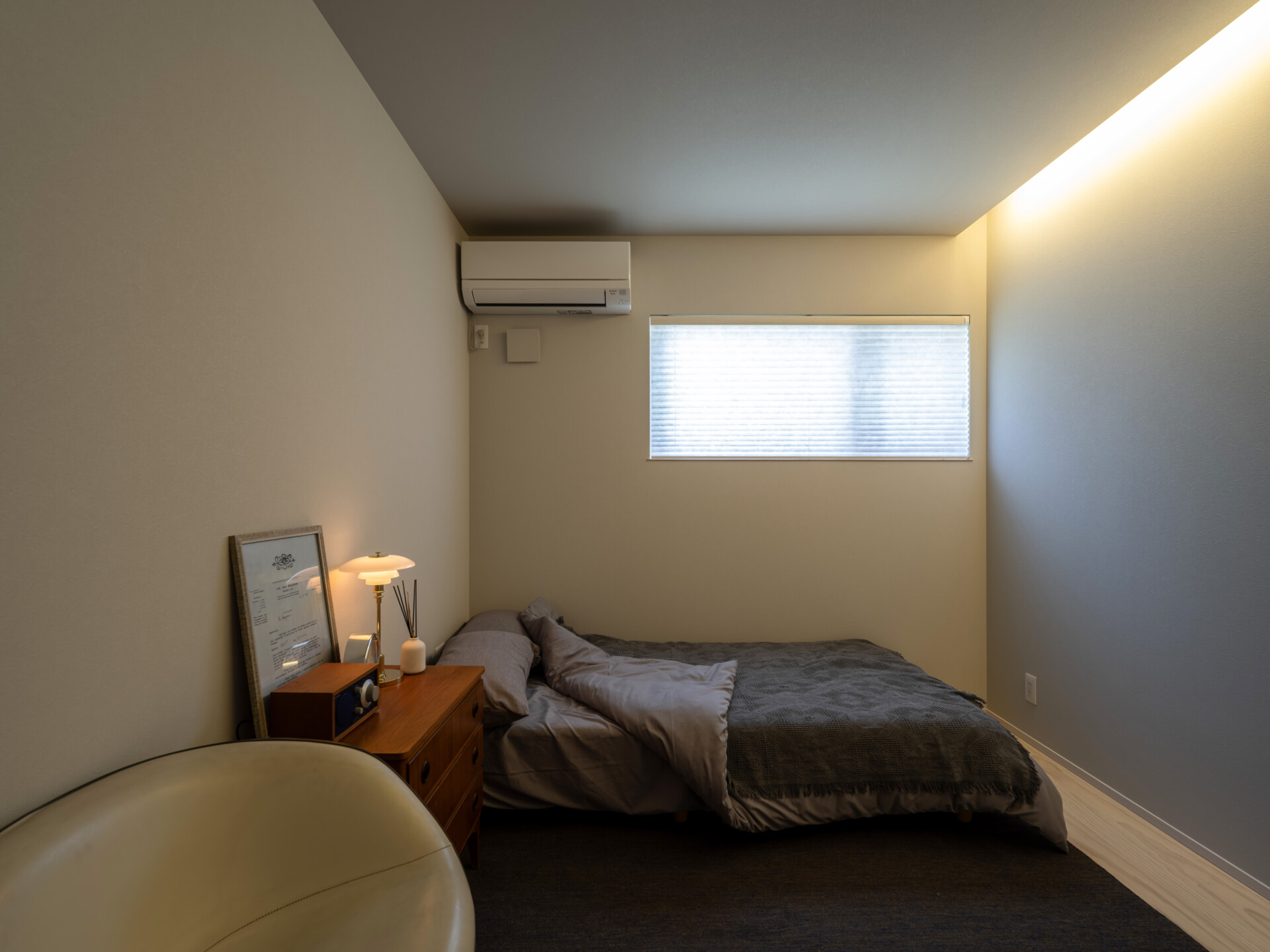 1階に設けられた寝室は、間接照明によって天井と壁の境界が柔らかく光る、落ち着いた空間です。グレーがかった壁の色が室内に静謐さをもたらし、木のフローリングと木の扉が自然な温かみを添えています。ビンテージのチェストやイームズのチェアなど、居住者のセンスが滲み出る家具が、この空間に個性と深みを与えています。