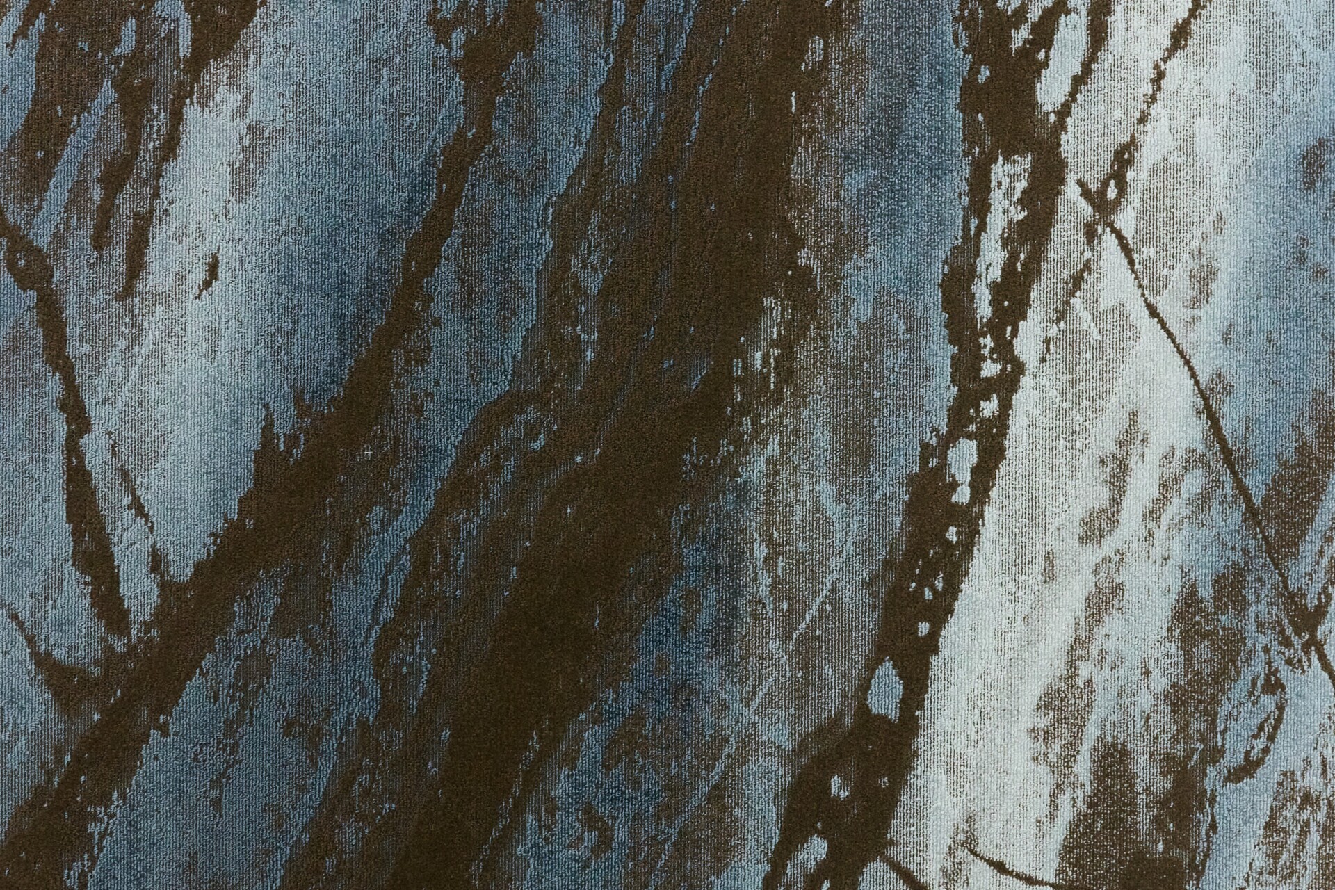 (H約600×W約200cm)は、オニキスが持つ吸い込まれるような透明感と静謐な美しさを、マシンタフトとインクジェットプリントで表現した大型作品です。タフティングによる繊細な石目調の基布に2色の染料を流し込み、グラデーションで染め上げることで、層の重なりをダイナミックに表現しています。凛とした静けさと大胆な存在感を兼ね備えた、空間を支配する力を持つ作品です。