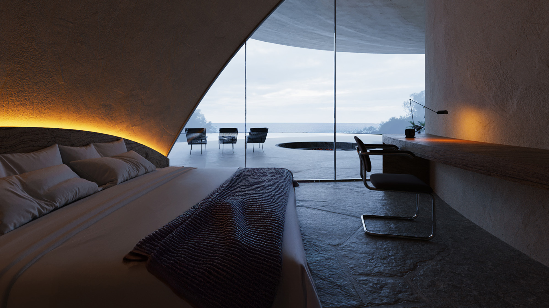 建築の輪郭が風景に対して強く主張するのではなく、むしろ環境の変化を受け止め、滞在者の記憶に沈殿していくような住まいを志向している点が印象的です。