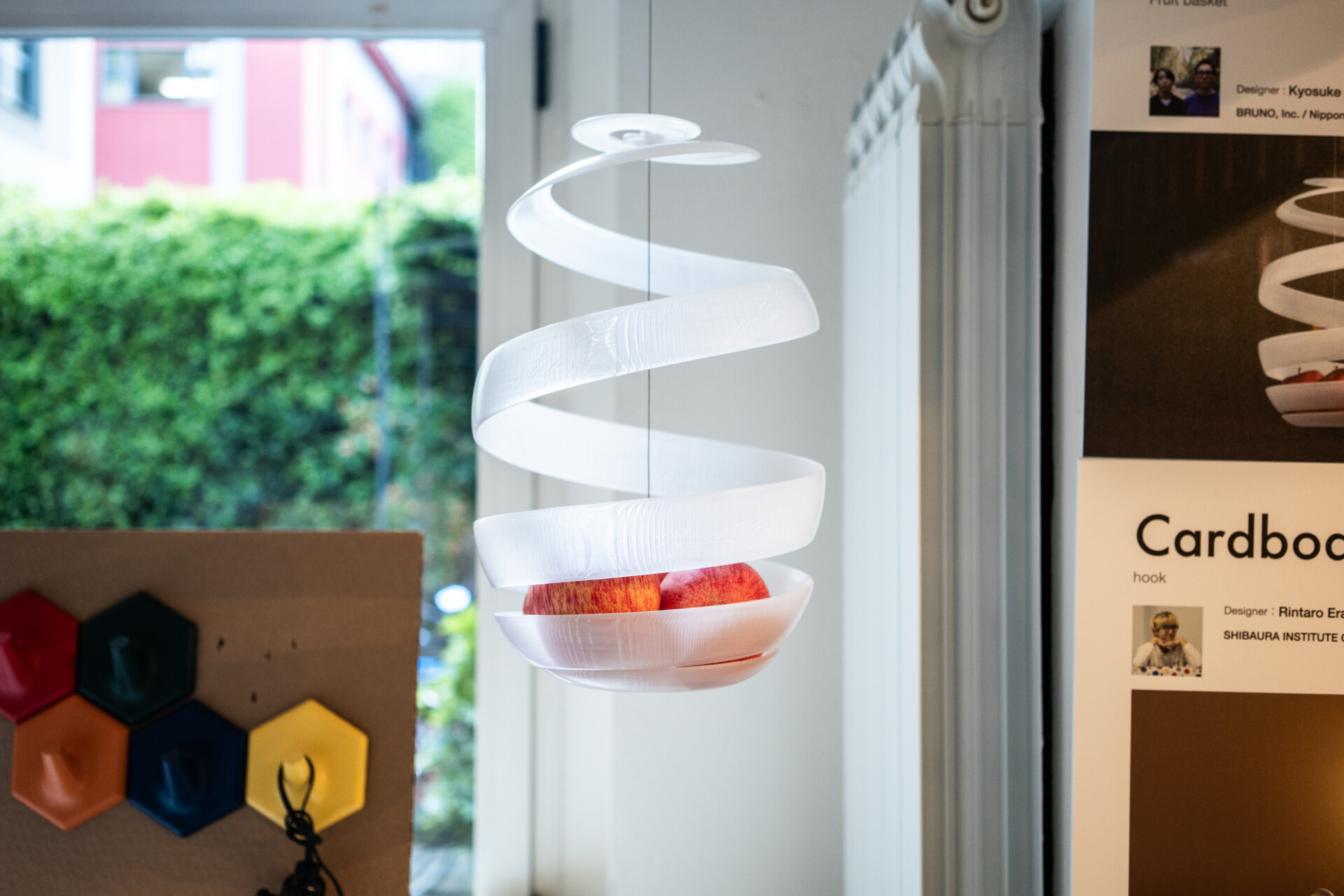 本体はりんごの皮をモチーフとした螺旋形のデザインで、吊り下げることで果実を空中に浮かせるように飾ることができます。3Dプリンティングによって複雑な形状を一体成形し、素材には透明PETG樹脂を採用。果実の持つ鮮やかな色彩を柔らかく透過することで、まるで光の中に浮かぶ宝石のような美しさを演出します。また、一度に多くの果実を支えるため、本体中心を上下に貫くワイヤーが荷重を受け止める構造も採用されており、機能美と造形美を高い次元で両立しています。