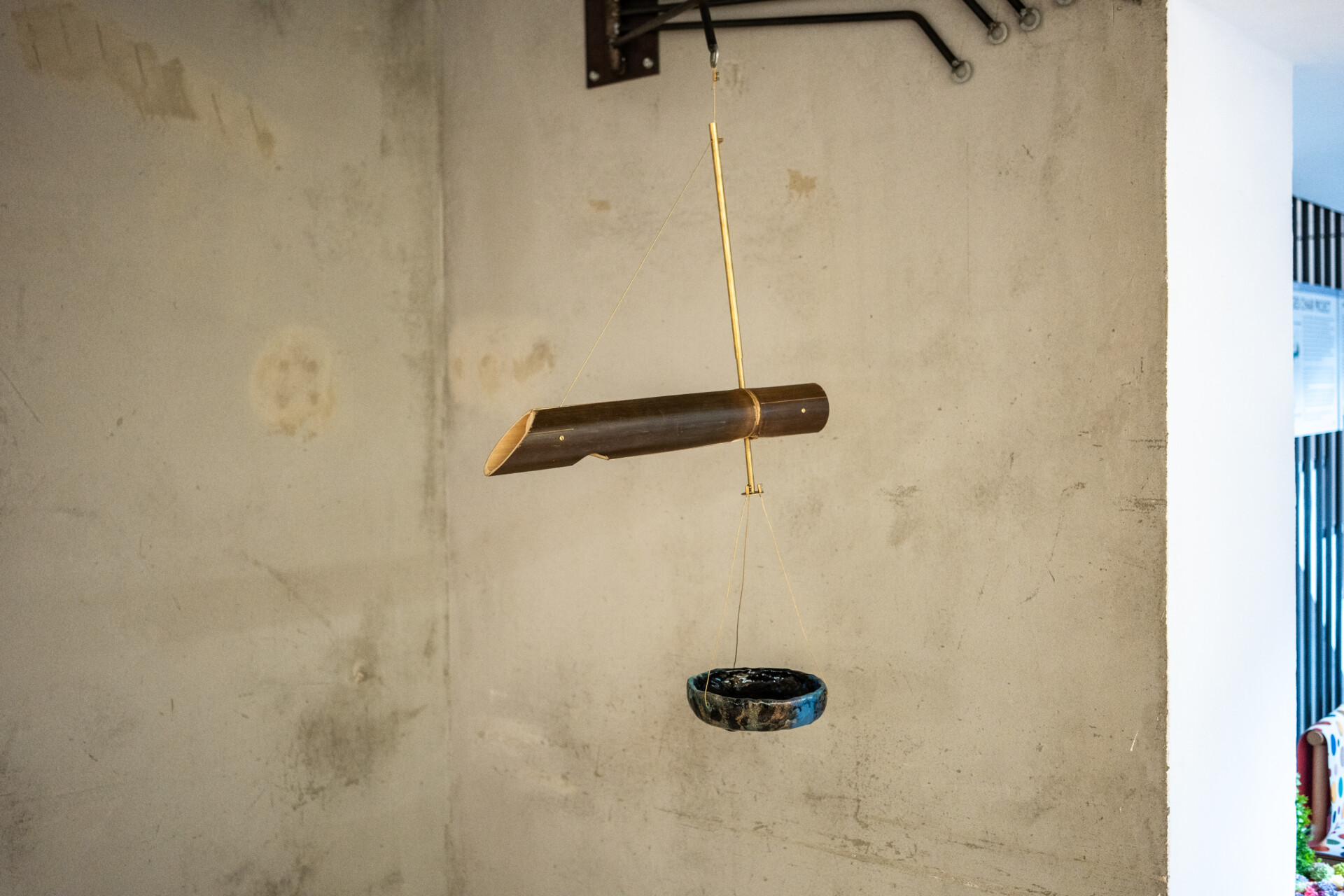 黒竹と真鍮金具で構成された照明システムには、自在鉤の仕組みが取り入れられており、上下の動きが可能なため、空間に対して柔軟に対応できます。日本の美意識と伝統工芸の技術を世界有数のデザイン教育機関で学ぶ学生が融合させたこの作品は、ミラノの地においても、訪れた人々の心に静かな余白をもたらしていることでしょう。