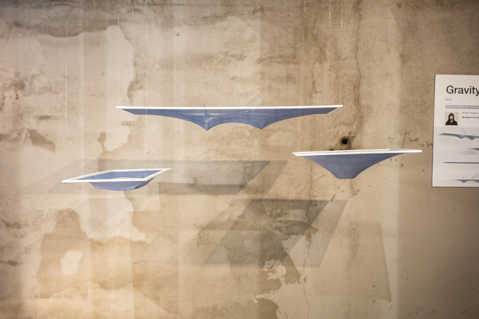 「人はなぜ、物を整理し、空間を空けようとするのだろうか」——この問いから生まれたのが「Gravity Well」です。武蔵野美術大学のチョン・スヨンさんが設計したこの棚は、伸縮性のある布素材で構成されており、物を置くとその重さや形状に応じて表面が自然に沈み込みます。