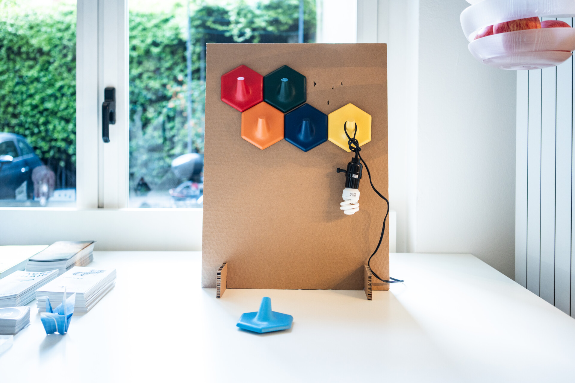 六角形のモジュールを基本とするこの作品は、自由に組み合わせて壁面に配置できる設計になっています。複数のユニットをつなぎ合わせることで、無機質な段ボールの壁面にリズムと立体感が生まれます。そして表面の突起部分は、視覚的なアクセントとなるだけでなく、フックとしての実用的な機能も果たします。